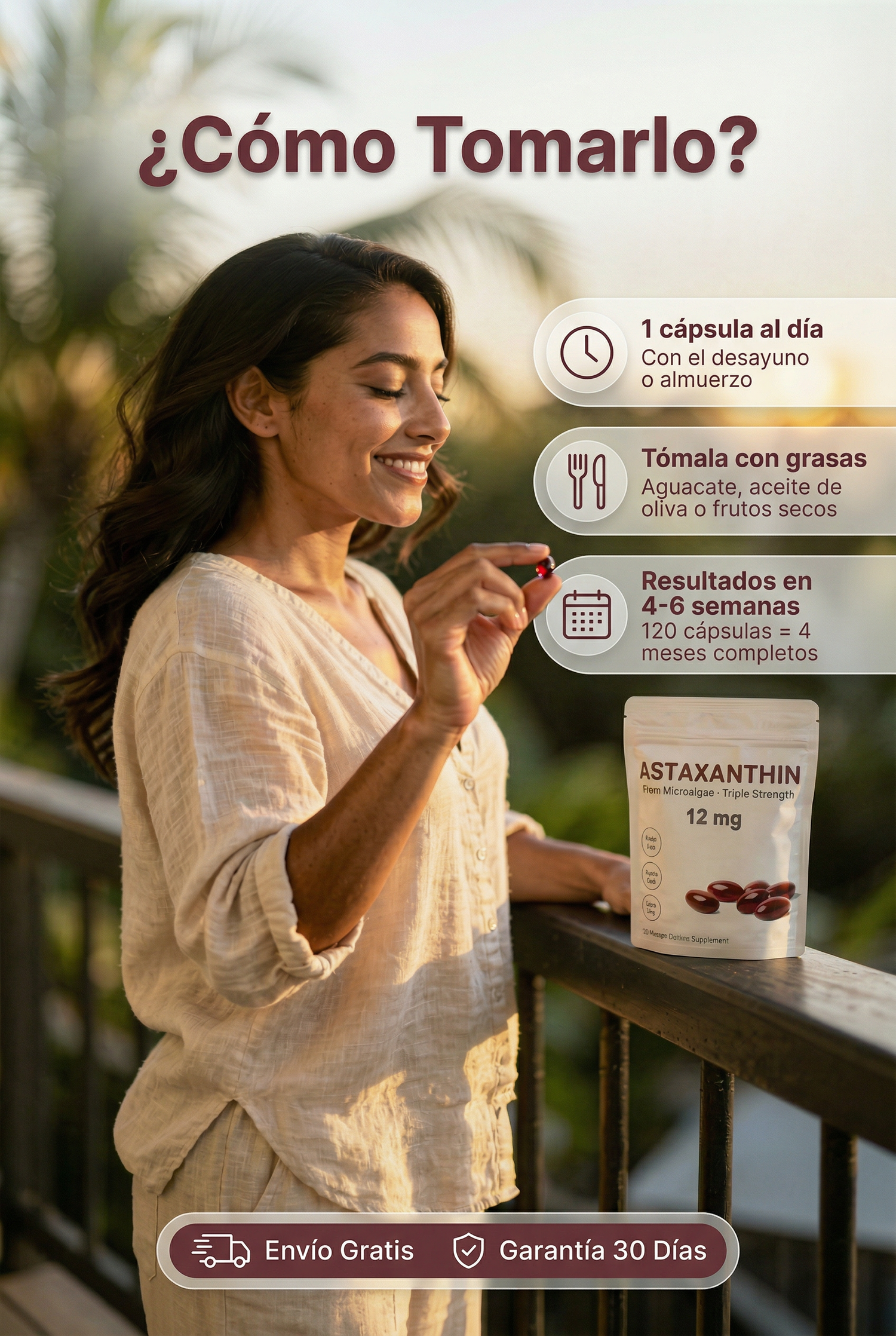 La mayoría nota mejoras entre la semana 4 y 6. La astaxantina se acumula en tus tejidos gradualmente, ofreciendo protección cada vez más profunda.